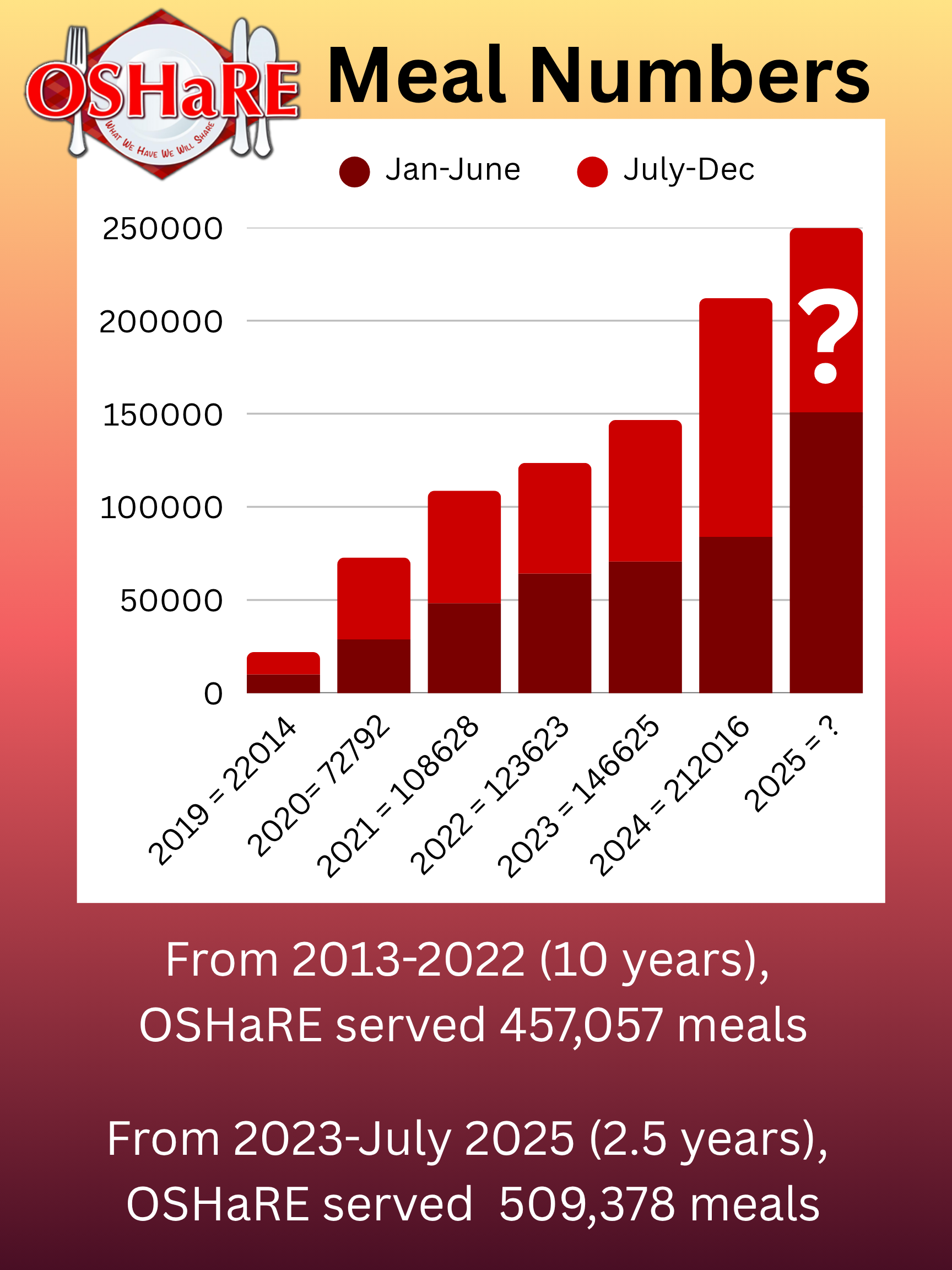 OSHaRE is serving meals Monday to Saturday (excluding Wednesdays) from 12:00pm-1:30pm (dine in is available from Monday to Friday) and Monday to Friday (excluding Wednesdays) 4:00pm to 5:00pm. Wednesdays we serve lunch and dinner together from 1:00pm-3:00pm. We are located at 946 3rd Ave. E. Owen Sound, Ontario. From 2023 to 2024 we saw a 45% increase in the number of meals being served to the community. The greatest increase was in the number of families accessing our services. We are so thankful for our amazing volunteers, community partners, staff, donors and the whole community for helping us to meet this increased demand. Thank you for helping us to share at OSHaRE.